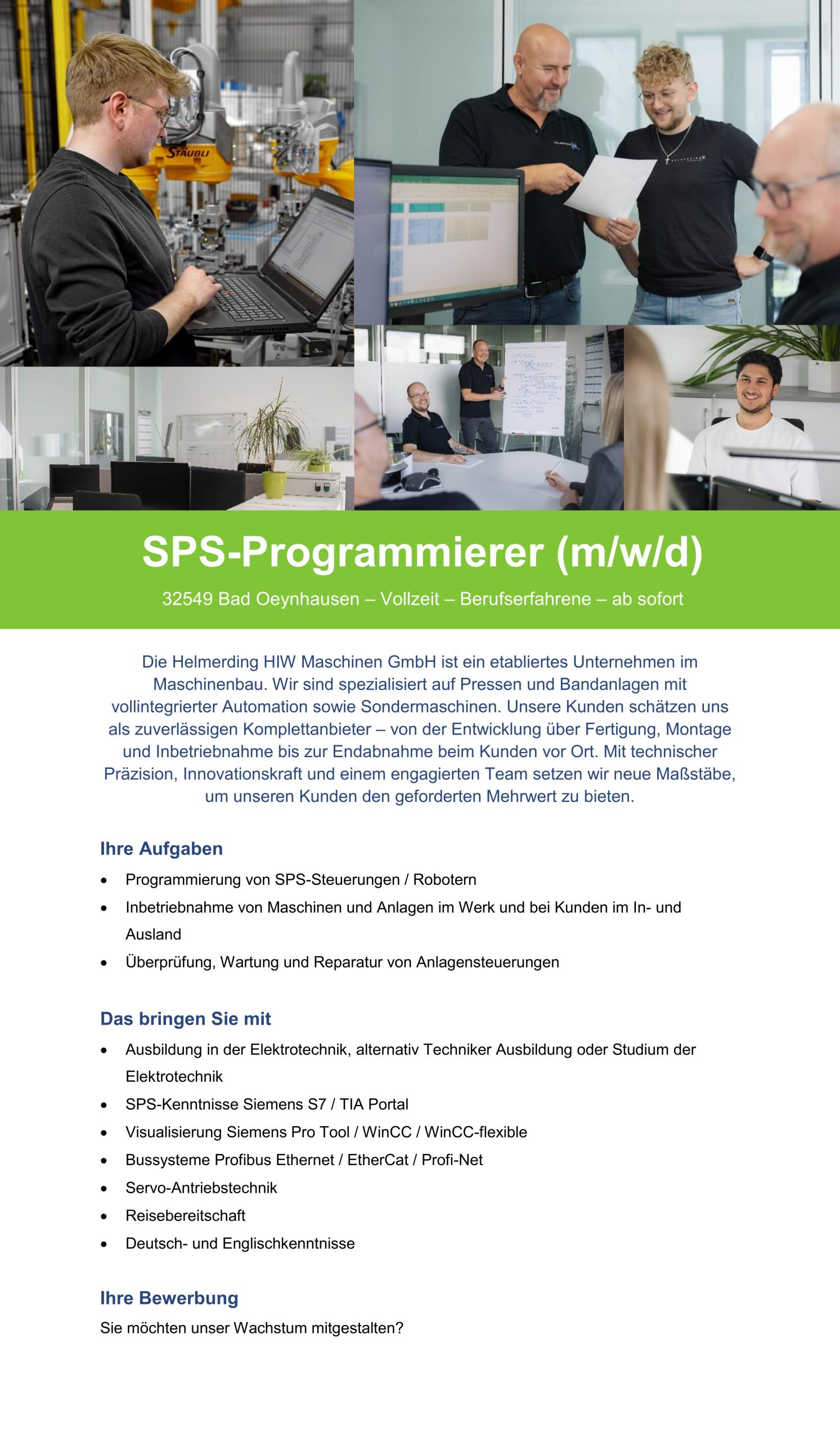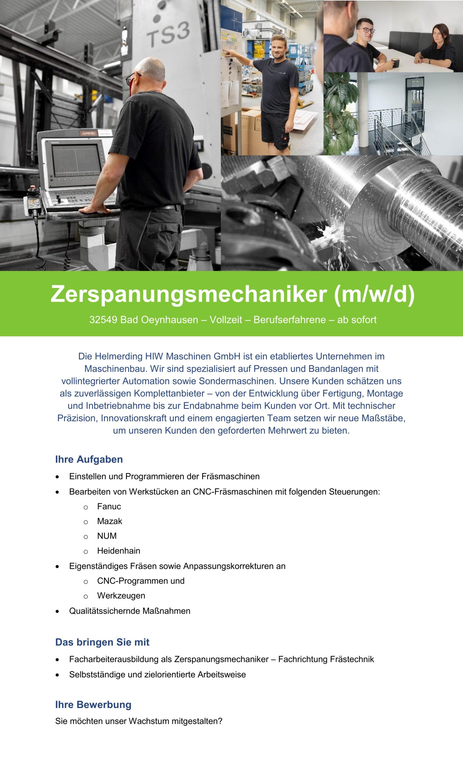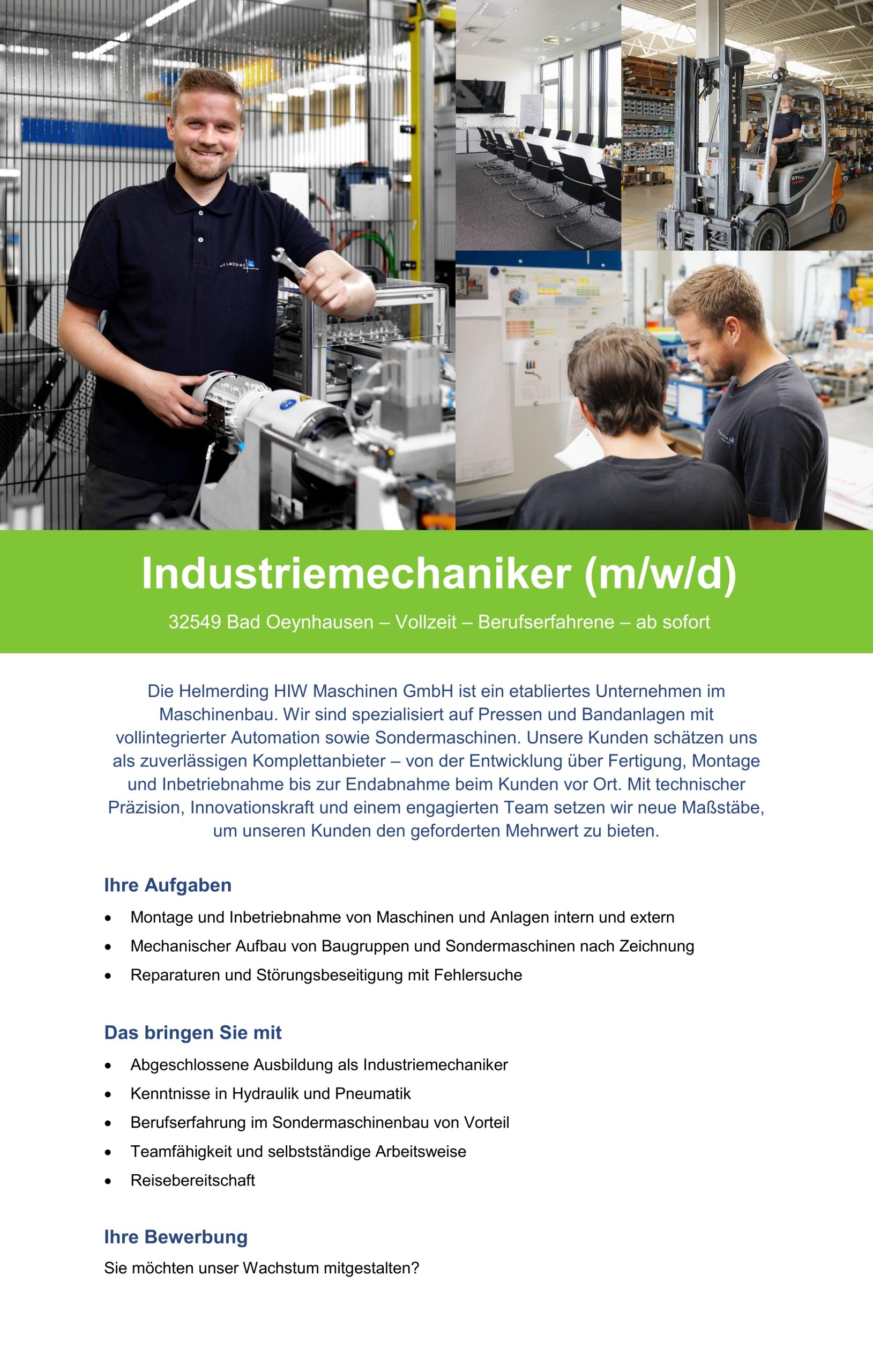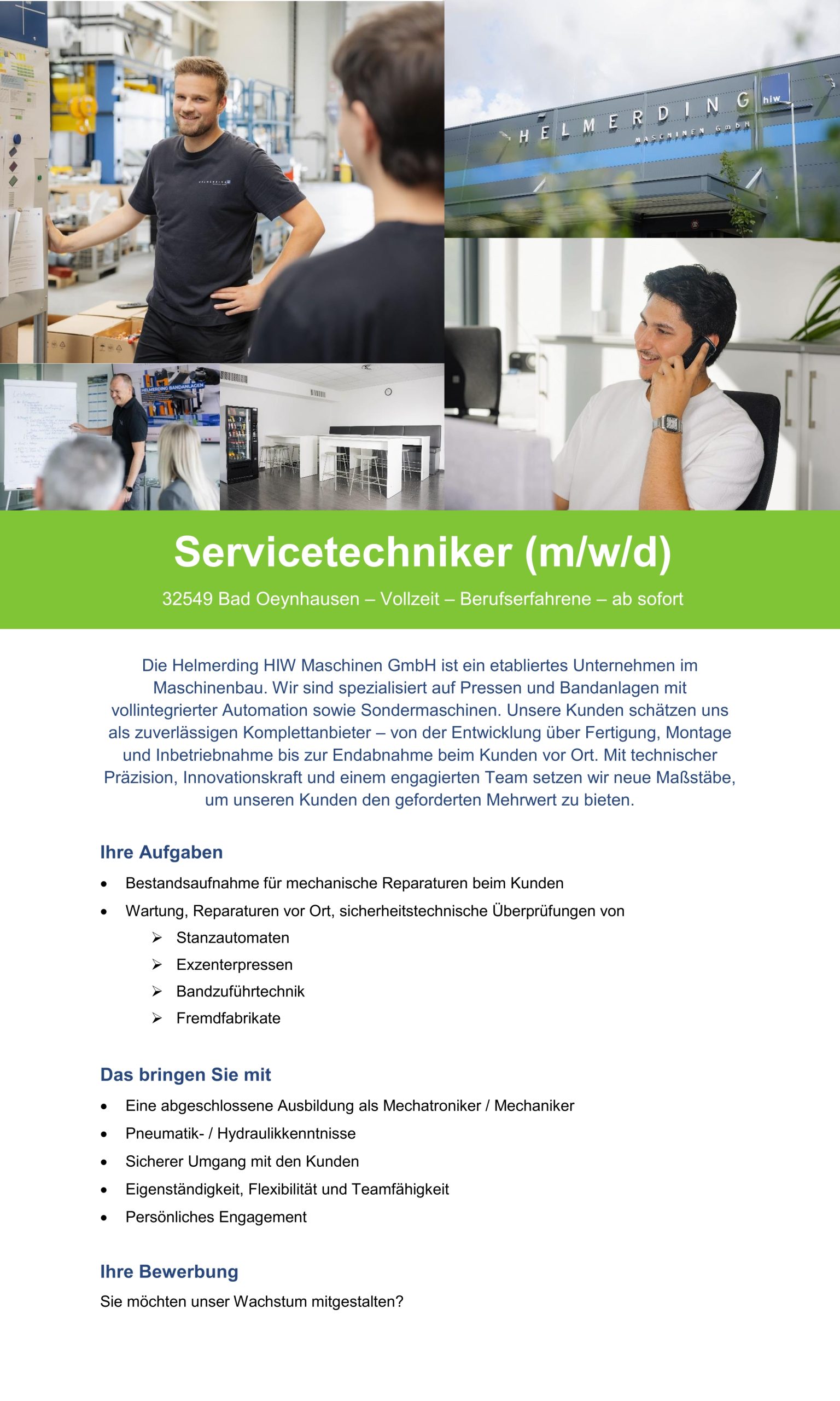 Wir sind ein international tätiges Maschinenbauunternehmen im Bereich mechanische Pressen und Sondermaschinenbau mit über 120 Mitarbeitern. Unsere Marke Helmerding steht für Kompetenz und Innovation „Made in Germany”. Unser Blick ist in die Zukunft gerichtet.