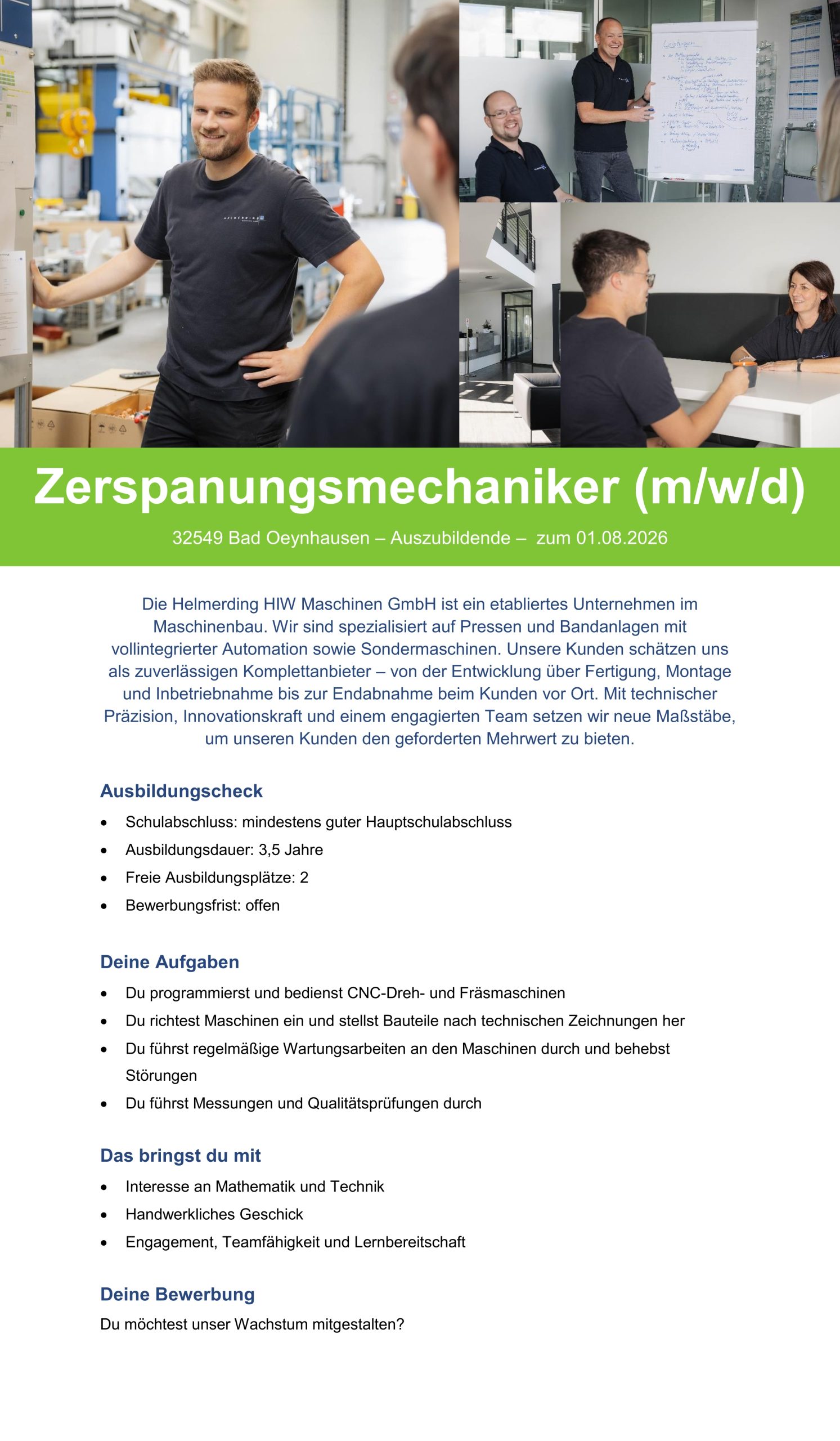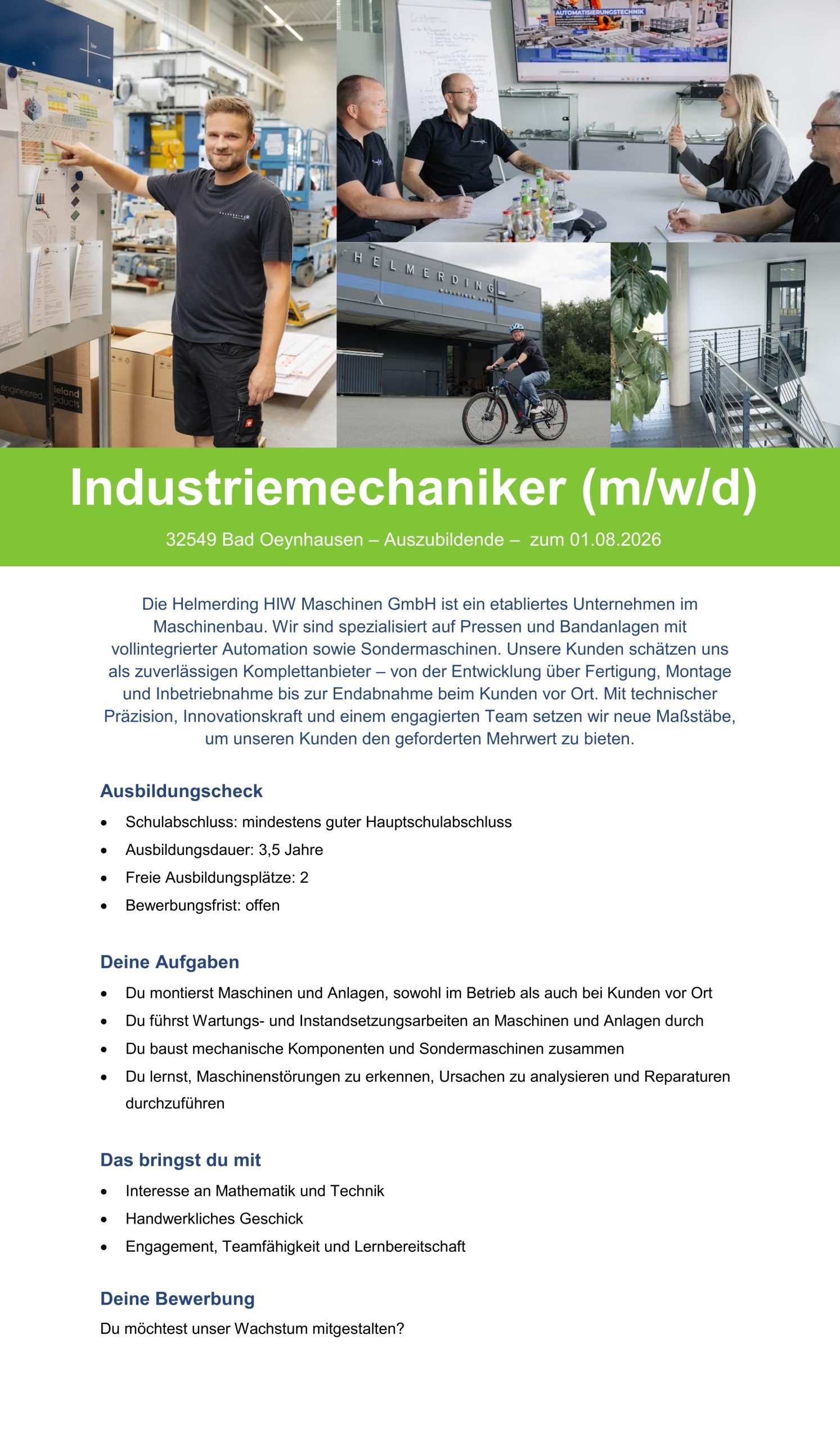 Wir sind ein international tätiges Maschinenbauunternehmen im Bereich mechanische Pressen und Sondermaschinenbau mit über 120 Mitarbeitern. Unsere Marke Helmerding steht für Kompetenz und Innovation „Made in Germany”. Unser Blick ist in die Zukunft gerichtet.