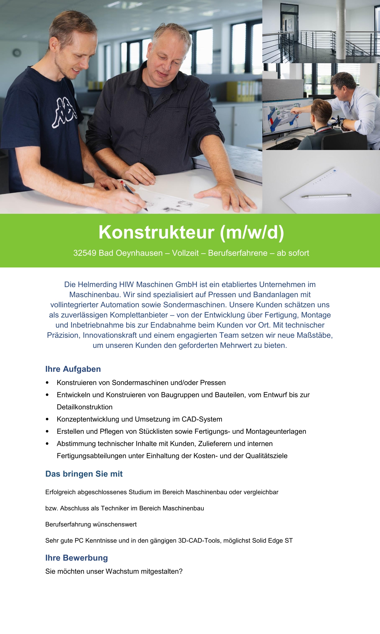 Wir sind ein international tätiges Maschinenbauunternehmen im Bereich mechanische Pressen und Sondermaschinenbau mit über 120 Mitarbeitern. Unsere Marke Helmerding steht für Kompetenz und Innovation „Made in Germany”. Unser Blick ist in die Zukunft gerichtet.
